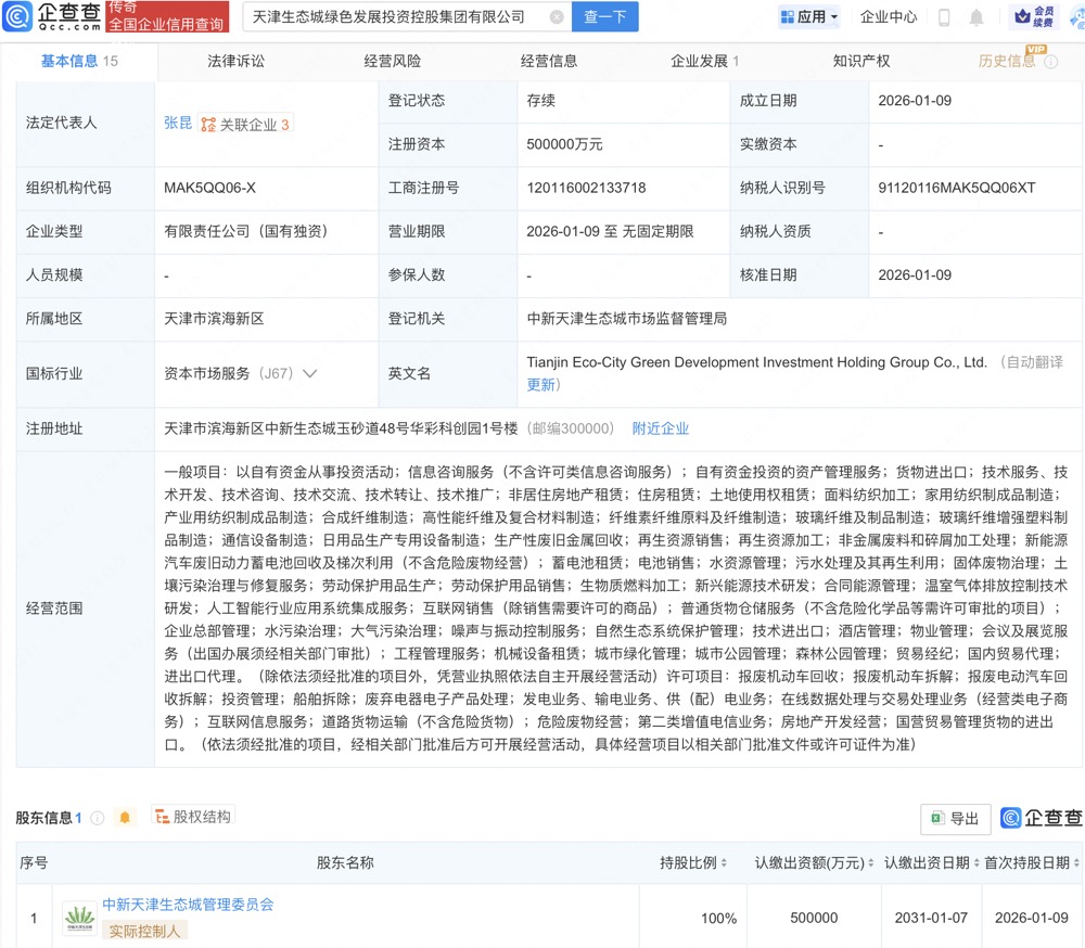 近日,天津生态城绿色发展投资控股集团有限公司成立,法定代表人为张昆,注册资本50亿元,经营范围含以自有资金从事投资活动、自有资金投资的资产管理服务、人工智能行业应用系统集成服务、互联网销售等。企查查股权穿透显示,该公司由中新天津生态城管理委员会全资持股。